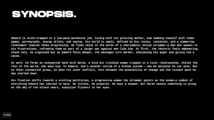 A young man, lost and unseen, is drawn into a dark undercurrent when a politician’s visit stirs something restless within him, pulling him toward an unsettling path that blurs purpose and danger.